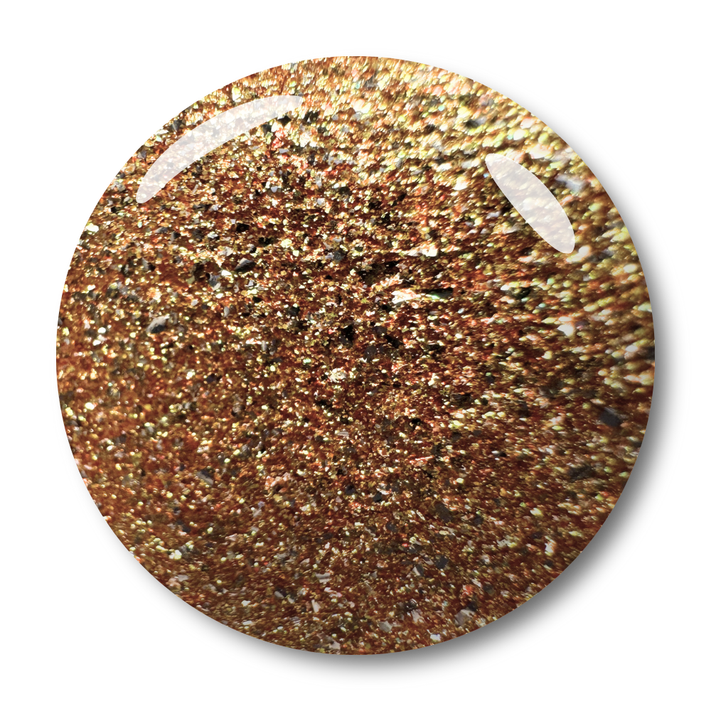 A vibrant peachy-gold swirl with silver micro-shimmer. Marble-like finish with a playful, dynamic effect.