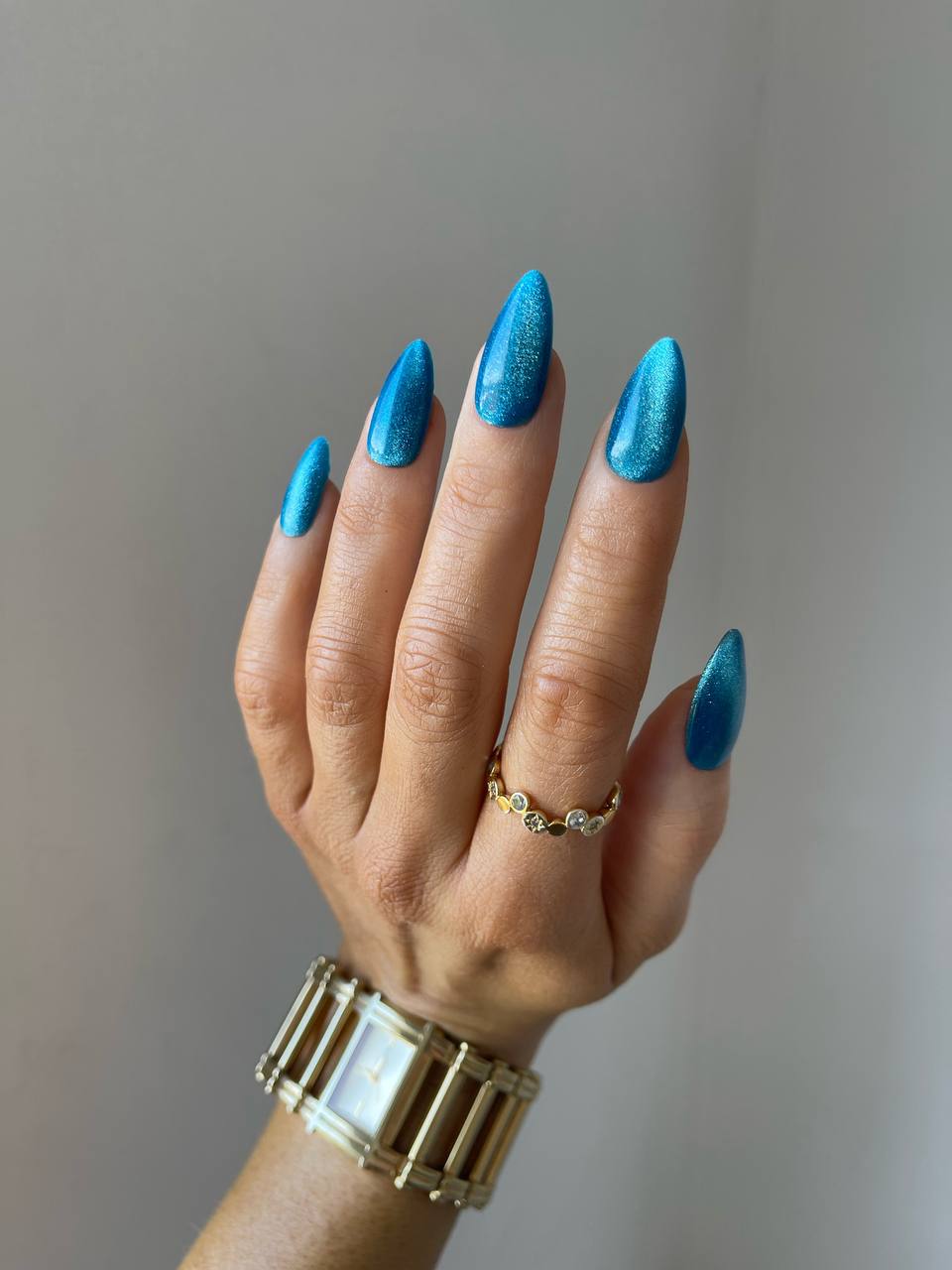 A deep teal blue with cool undertones. The magnetic shimmer moves like light across water, giving it a pool-reflection glow.