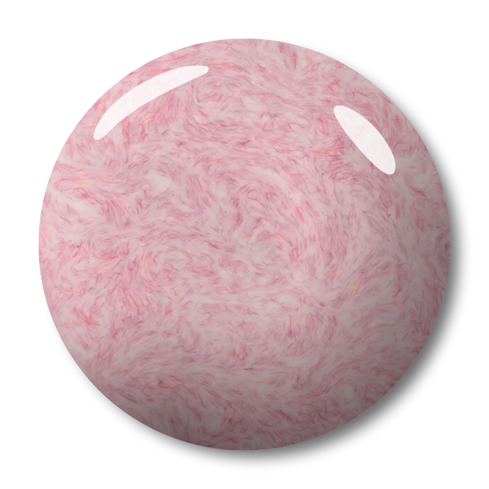 Milky white base swirled with soft petal pink fibers. Neutral-toned with a delicate feathered texture.