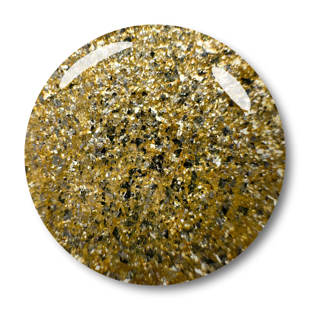 A deep tarnished gold with olive undertones. The chunky reflective foil flakes add a molten, textured sparkle.
