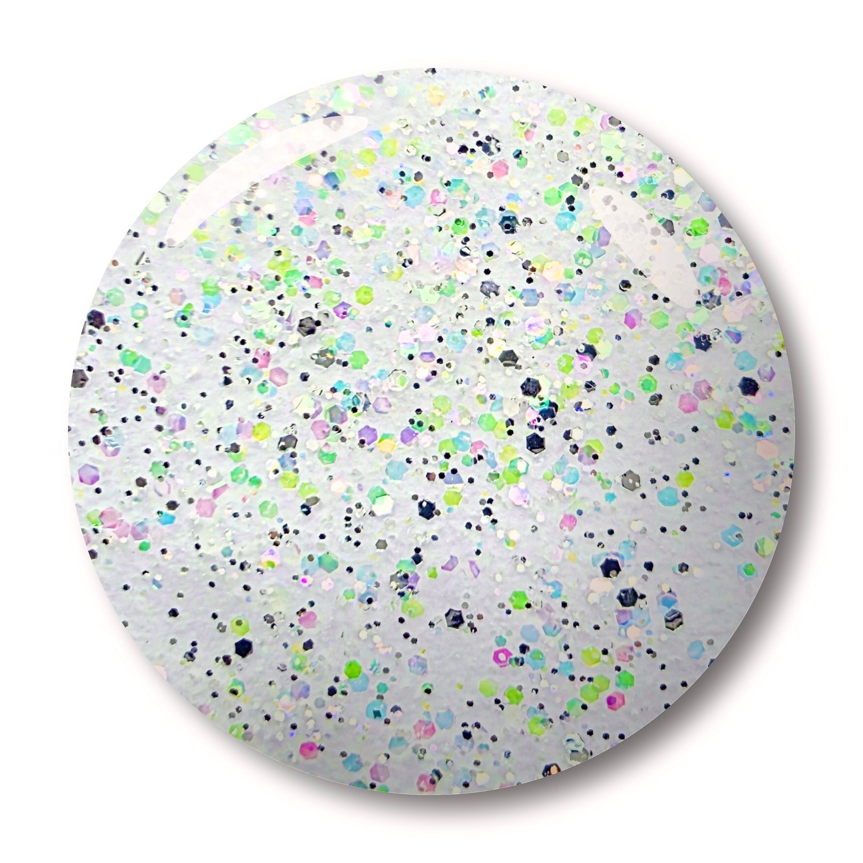 A translucent clear base scattered with iridescent pastel glitter. Light, airy, and softly sparkling with a sheer, glassy finish.