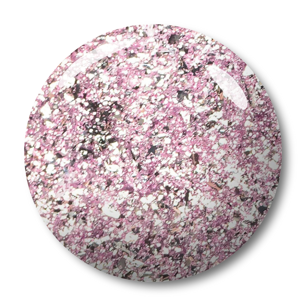 Pink-lavender base packed with silver and gunmetal foil. Cool-toned with a multidimensional foil flake finish.